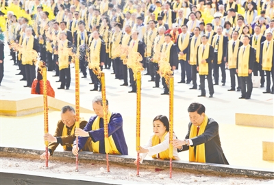 當(dāng)日上午,黃帝故里園區(qū)旗幡獵獵、莊嚴(yán)肅穆。南門廣場上,龍騰虎躍,鼓聲震天。寓意著中華兒女來自五湖四海的540名炎黃子孫,分別組成各90人的文化方陣、岐黃方陣、企業(yè)方陣、同拜方陣、臺胞方陣、僑胞方陣六大拜祖隊(duì)伍,整肅衣冠,佩戴黃帝絲巾,進(jìn)尋根門、經(jīng)系祖壇、上軒轅橋、過故里祠,觀甲骨碑林方柱高舉,感杜嶺方鼎王者風(fēng)范,聽青銅編鐘古音繚繞,最后緩步來到拜祖廣場,端詳兩側(cè)連廊浮雕,感觸中華文明五千多年的源遠(yuǎn)流長。