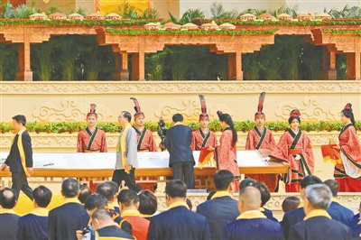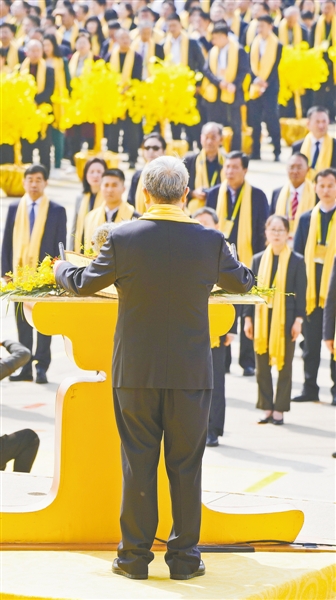 凈手上香。郝龍斌,全國人大代表、中國和平統(tǒng)一促進(jìn)會香港總會常務(wù)副會長凌友詩,英國荷柏穎中藥公司總裁、第一位擔(dān)任英國市政廳閣員高職的華裔官員王臺生,泰國中華總商會主席林楚欽,緬甸中華總商會榮譽(yù)會長楊釧玉,華為集團(tuán)高級副總裁楊瑞凱,深圳國際控股有限公司董事會主席李海濤,優(yōu)必選科技股份有限公司董事會主席、執(zhí)行董事兼行政總裁周劍,全國人大代表、全國勞模、好想你健康食品股份有限公司董事長石聚彬走到臺前,凈手上香。