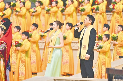 高唱頌歌。來自香港地區(qū)的鐘鎮(zhèn)濤、臺灣地區(qū)的朱孝天和澳門地區(qū)的麥嘉欣以及內(nèi)地的曹芙嘉,與56個(gè)民族的少年兒童一起,同歌《黃帝頌》,共聚家國情。