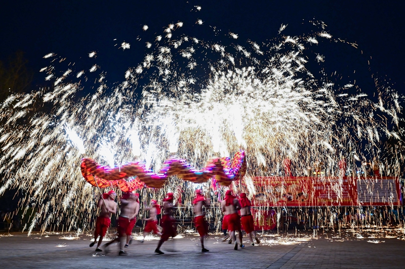 民間藝人在河南省洛陽市2024隋唐河洛文化廟會上表演打鐵花(2024年2月14日攝)。新華社發(fā)(李衛(wèi)超 攝)