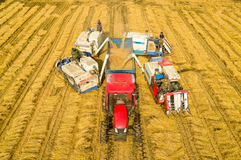 在黑龍江省綏化市北林區(qū)雙河鎮(zhèn),村民駕駛收割機進行卸糧作業(yè)(2024年10月13日攝,無人機照片)。新華社記者 張濤 攝